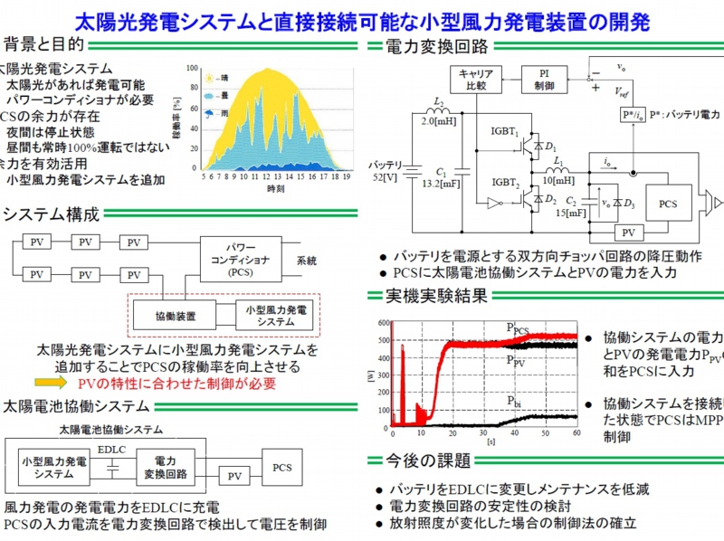 本研究では,パワーコンディショナの余力を活用するために,小型風力発電システムを接続する。しかし,そのままでは太陽電池と特性が異なるため協働装置を用いて電力を変換し,あたかも太陽電池パネルの一つとして動作するシステムの開発を目指している。