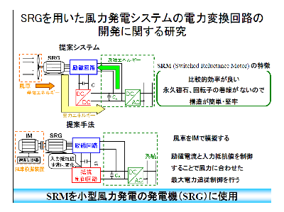 SRGは現在電動機としての適用例はいくつか報告されているが,発電機としての適用については未知数の部分が多い。そのため,制御法の研究,及び発電電力の変換器の開発を現在行っている。