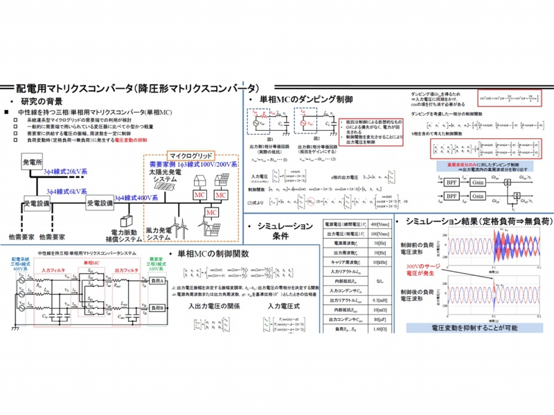 本研究は任意の周波数・電圧の交流を直接変換する子マトリックスコンバータを用いて,電源電圧に依らず,常に安定した電力を需要家に供給するシステムについて検討している。現在は負荷変動時に現れる電圧の変動を抑制する方法について検討を行っている。
